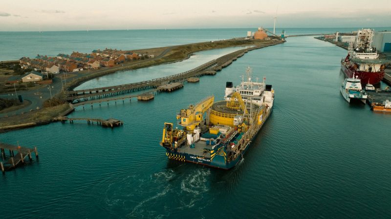 Cable lay vessel CMOS Installer left port with the 28 kilometre section of 220kV, three-phase export cable yesterday evening.
