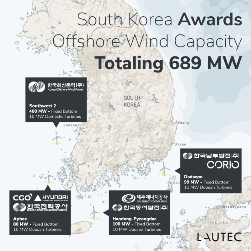 South Korea’s Ministry of Trade, Industry, and Energy (MOTIE) has awarded four offshore wind projects capacity totaling 689 MW.