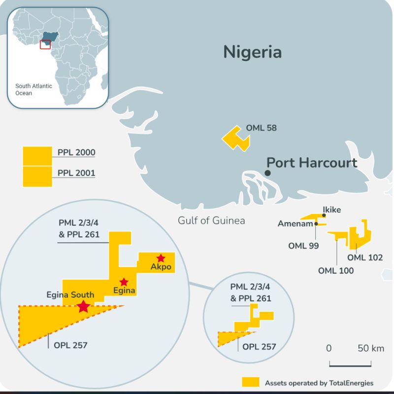 Covering an area of around 370 square kilometers, OPL 257 is located 150 kilometers offshore the coast of Nigeria. This block is adjacent to PPL 261, where TotalEnergies (24%) and its partners discovered in 2005 the Egina South field, which extends into OPL257. An appraisal well of Egina South is planned to be drilled in 2026 on OPL257 side, and the field is expected to be developed as a tie-back to the Egina FPSO, located approximately 30 km away.