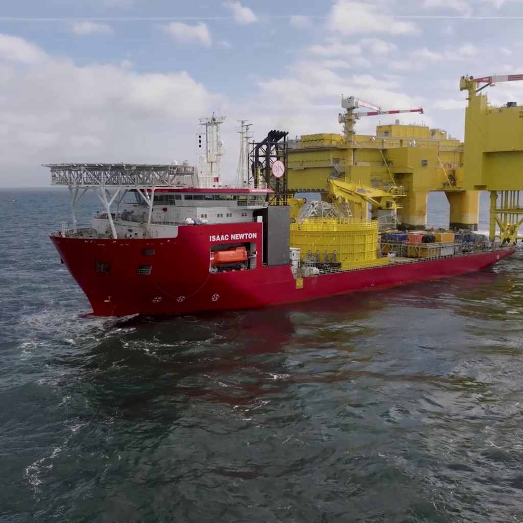 Cable-laying vessel Isaac Newton transported the three 155 kV cables from Hellenic Cables’ vertically integrated submarine cable plant in Corinth, Greece. She installed them between the TenneT offshore convertor station DolWin kappa and the two offshore wind farm locations of Nordseecluster 1 and 2. At crossings with other subsea infrastructures, the vessel installed concrete mattresses. The multi-purpose vessel Adhémar de Saint-Venant buried the cables along the entire cable routes using her trencher UTV1200.