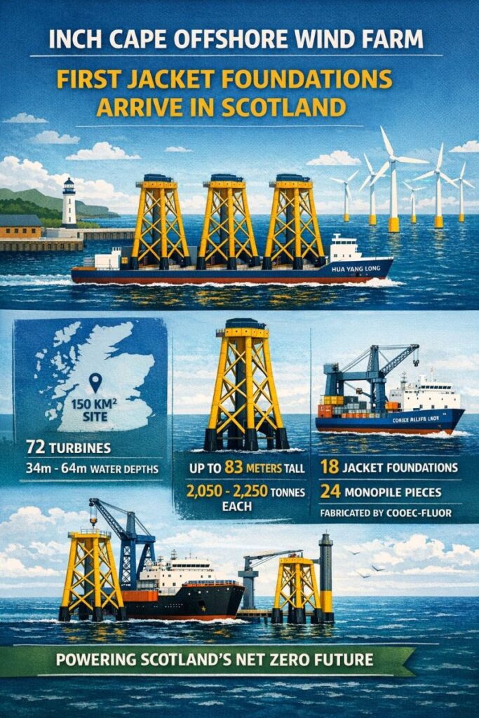 Located off the Angus coast, Inch Cape Offshore will feature 72 turbines across a 150 km² site, using a mix of jacket and XXL monopile foundations to suit water depths ranging from 34m to 64m.