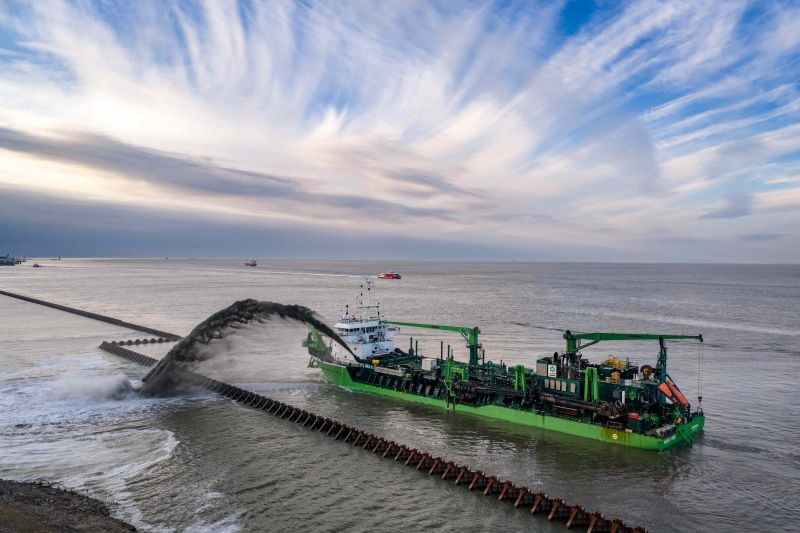 DEME’s trailing suction hopper dredger Meuse River is carrying out rainbowing works as part of the dredging and land reclamation activities.